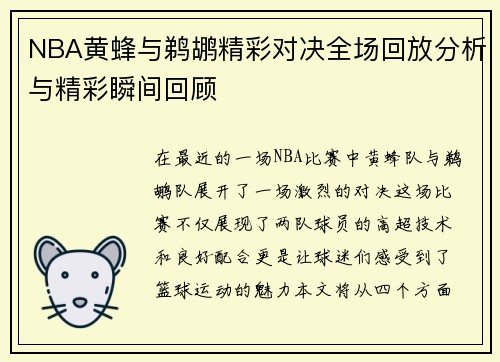 NBA黄蜂与鹈鹕精彩对决全场回放分析与精彩瞬间回顾